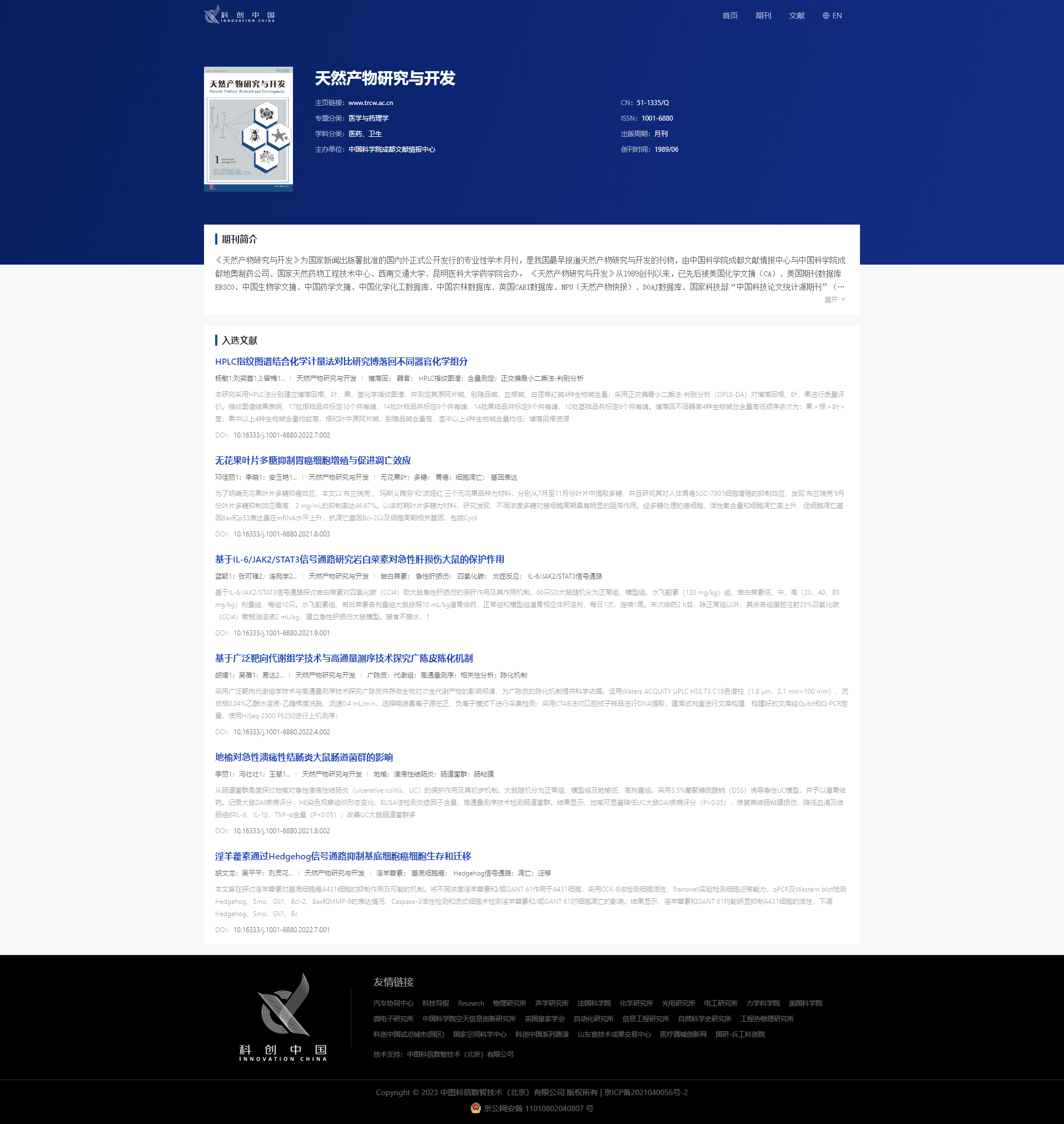 经专家遴选及综合考虑学科布局要求,2022年全国共有226本期刊,3024篇文献入选。《天然产物研究与开发》共有6篇文章在“科创中国”网站的双语长摘要专栏进行宣传推广(https://www.shuangyucb.com/cn/detail?id=144)。