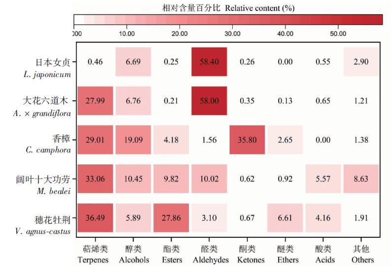 Analysis of the flower fragrance components and aroma characteristics of five trees and shrubs